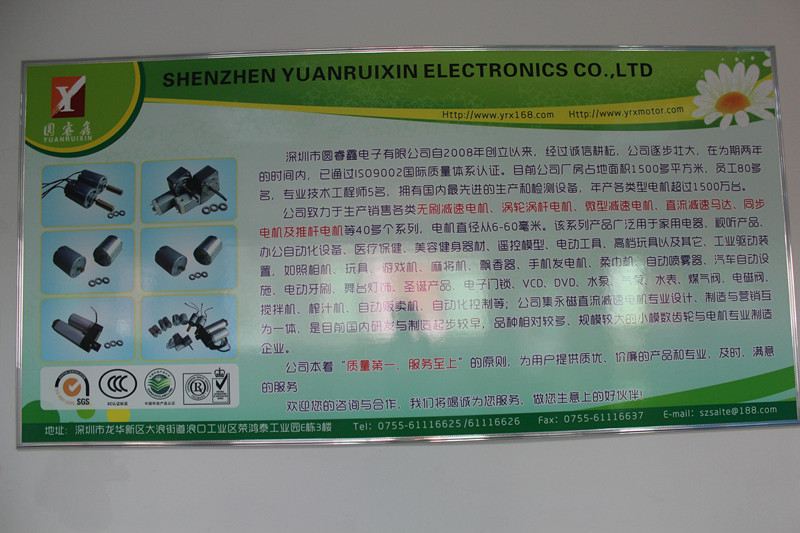 深圳市圓睿鑫電子有限公司自2008年創(chuàng)立以來,經過誠信耕耘,在為期兩年的時間內,已通過ISO9001:2000國際質量體系認證。公司廠房占地面積2000多平方米,員工100人,專業技術工程師6名,擁有國內最先進的生產和檢測設備,年產各類減速電機超過2~300萬臺。因公司發(fā)展需要,于2020年底,將生產基地遷往擁有最美小鎮之稱的東莞市清溪鎮,依山傍水,依托美麗的大自然環(huán)境和地方文化,全新的東莞市圓睿鑫電子有限公司將借助深圳母公司平臺,一步步走上新的臺階。